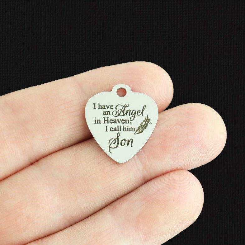"J'ai un ange au paradis, je l'appelle mon fils" charms cœur en acier inoxydable gravés au laser avec une image de plume, de notre ligne exclusive conçue par Bohemian Findings.