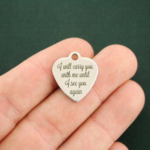 "Je vous emporterai avec moi jusqu'à ce que je vous revoie" charms cœur en acier inoxydable gravés au laser, de notre ligne exclusive conçue par Bohemian Findings.