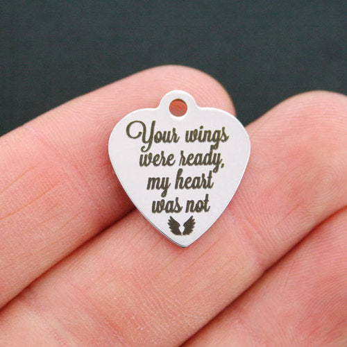 "Vos ailes étaient prêtes, mon cœur ne l'était pas" breloques en acier inoxydable gravées au laser avec image d'aile d'ange, de notre ligne exclusive conçue par Bohemian Findings.