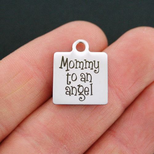 Breloques carrées en acier inoxydable gravées au laser "Maman à un ange", de notre ligne exclusive conçue par Bohemian Findings.