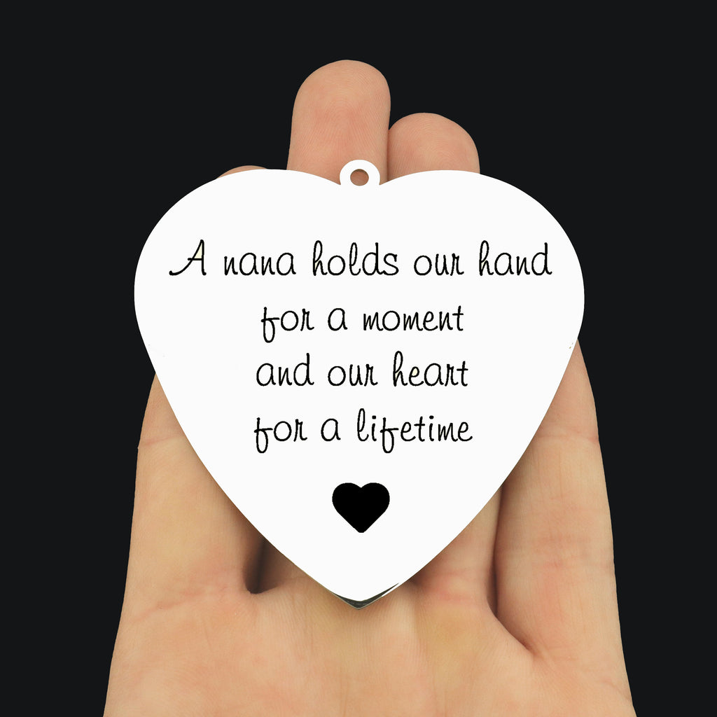 Take a look at these custom stainless steel Christmas ornaments! They are laser engraved with "A nana holds our hand for a moment and our heart for a lifetime".