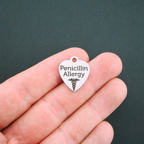Breloques cœur en acier inoxydable gravées au laser "Allergie à la pénicilline" avec image de caducée, de notre ligne exclusive conçue par Bohemian Findings.