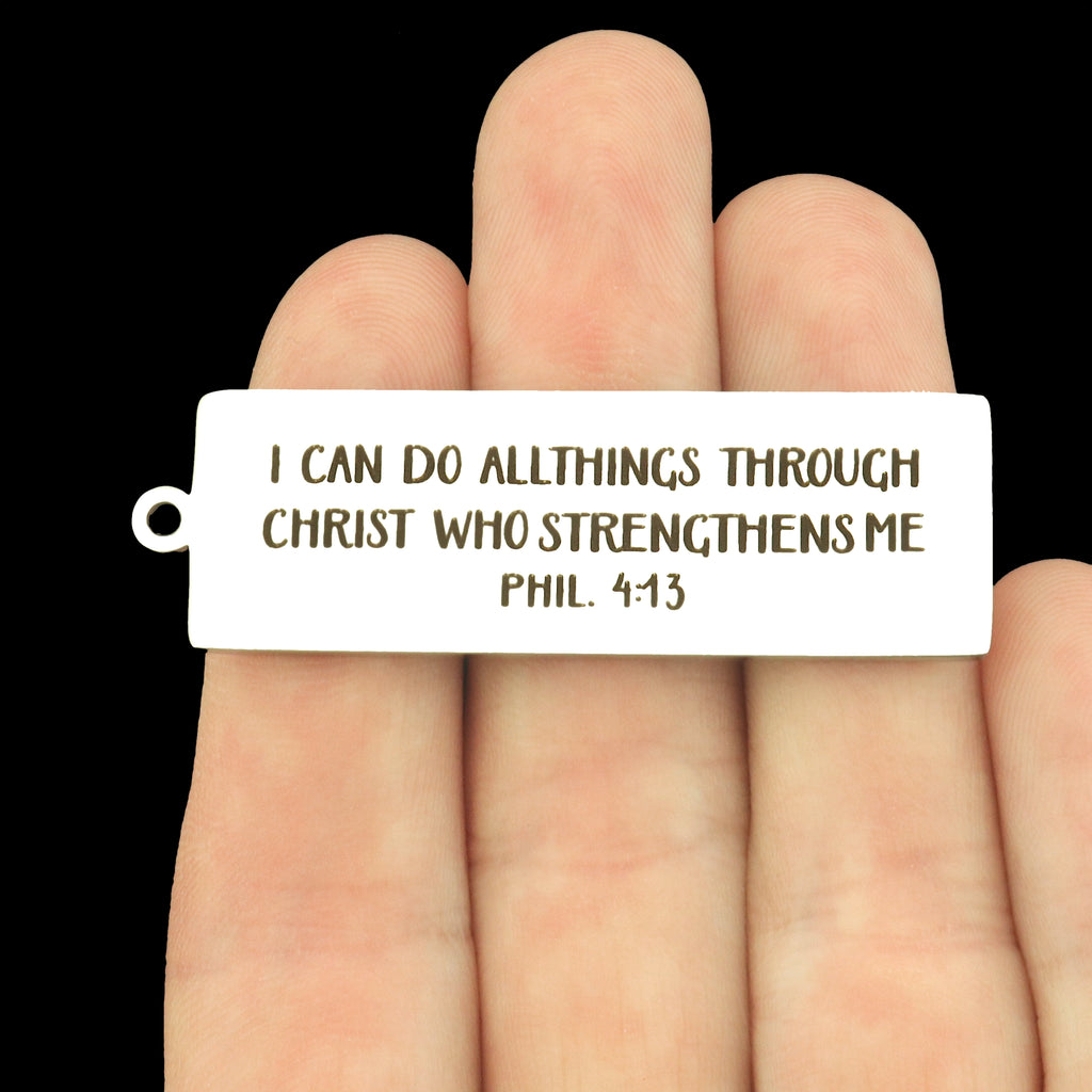 Check out these great religious key chain tags! They are engraved with a popular saying "I can do all things through Christ who strengthens me PHIL. 4:13". A perfect centre piece for your next key chain.