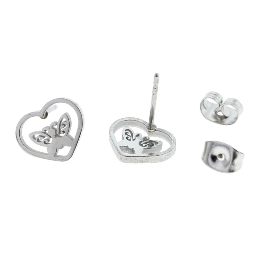Boucles d'oreilles clous coeur papillon argentées en acier inoxydable, parfaites pour un look simple !
