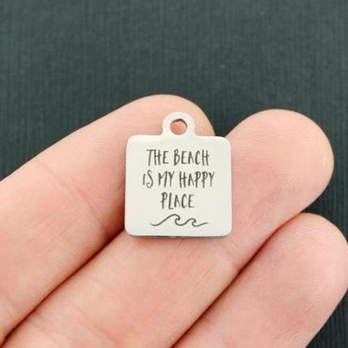 "La plage est mon endroit heureux" breloques carrées en acier inoxydable gravées au laser avec image de vague, de notre ligne exclusive conçue par Bohemian Findings.