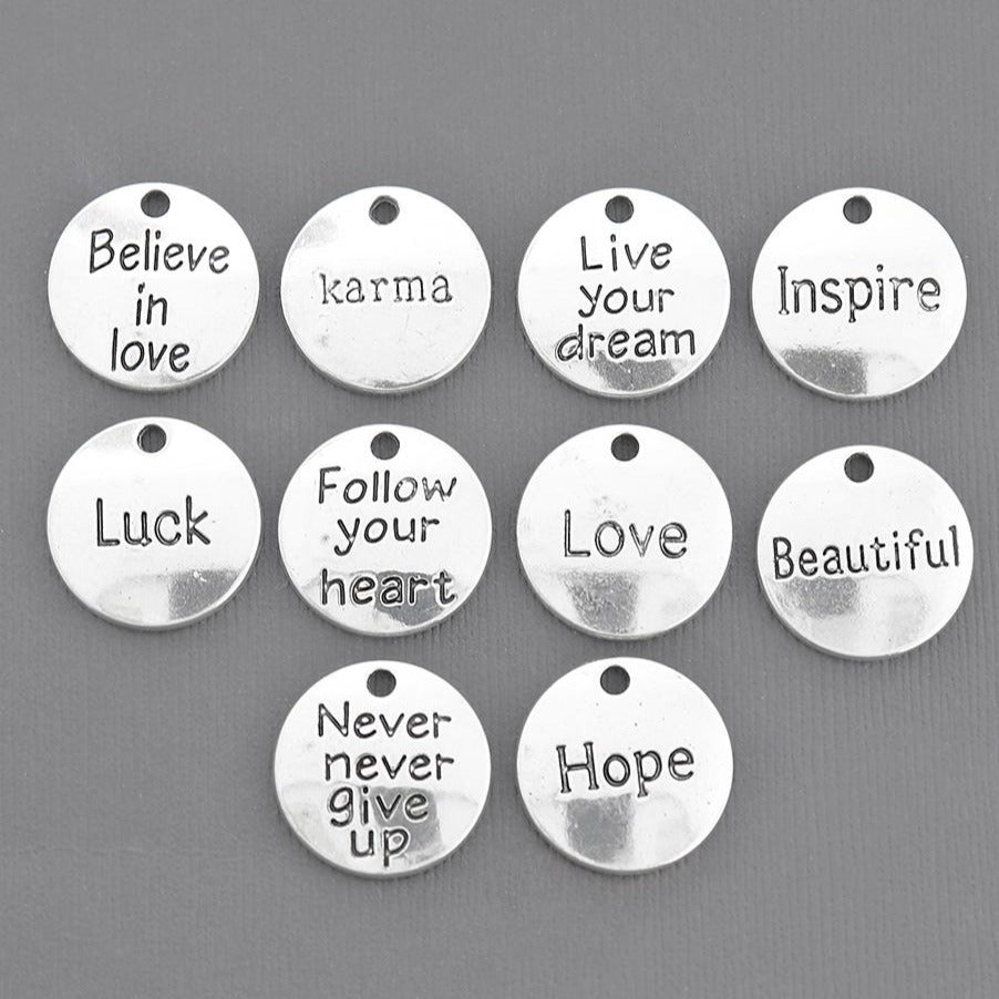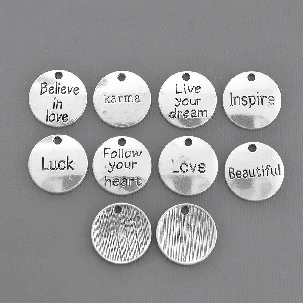 Collection sur le thème des mots de breloques argentées antiques, dans un métal en alliage de zinc. Parfait pour les bracelets, pendentifs, boucles d'oreilles, tirettes de fermeture éclair, signets et porte-clés !