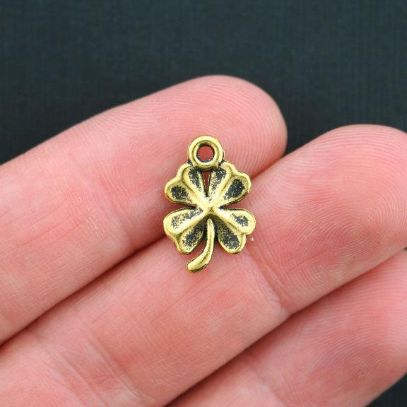 Four leaf clover antique gold tone charms, in a zinc alloy metal.