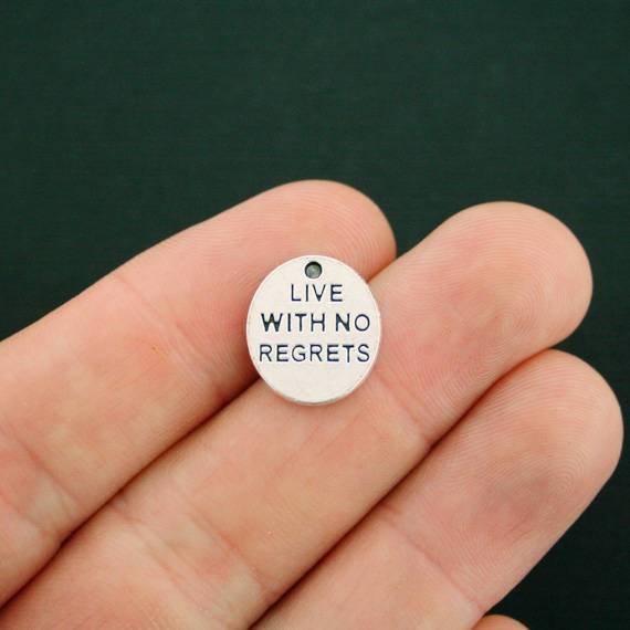 "Live with no regrets" tag antique silver tone charms, in a zinc alloy metal.