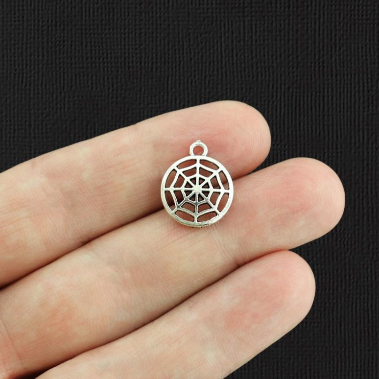 Spider web antique silver tone charms, in a zinc alloy metal.