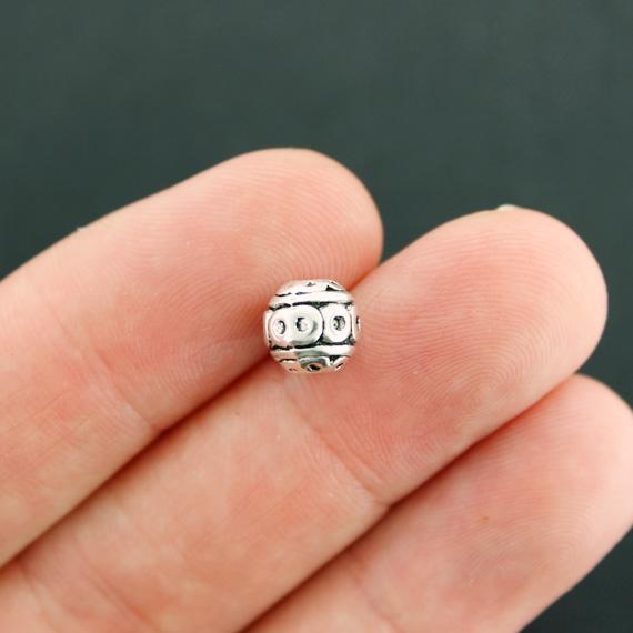 Silver tone zinc alloy metal beads in a 8mm spacer, with a metallic finish.