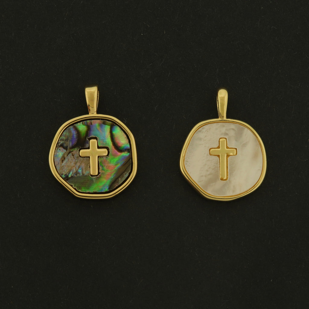 Check out these super cute cross disc charms... made of 18k gold plated brass, they are finished with eye catching natural mother of pearl shell inlay.