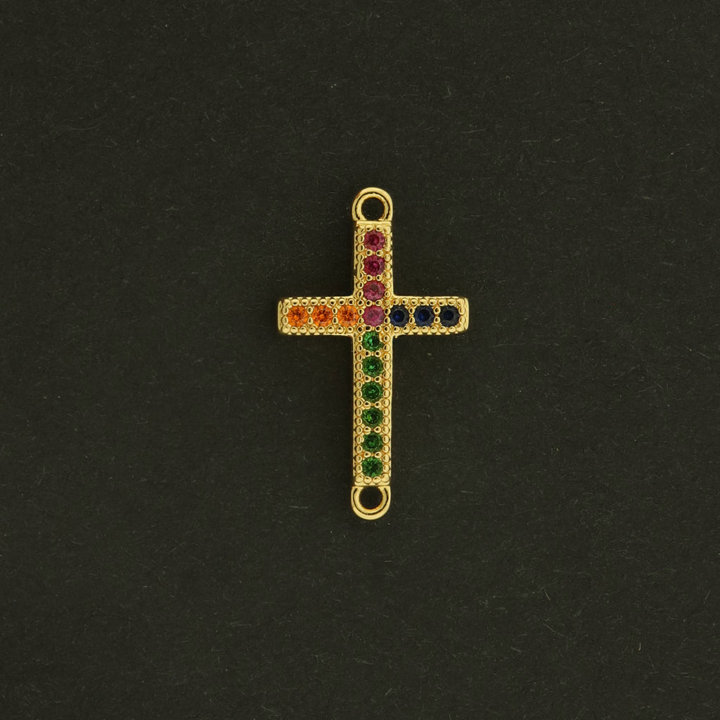Multicolored rhinestone inset cross gold tone connector charms, in an 18k gold plated brass metal.