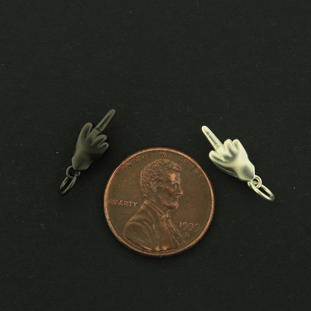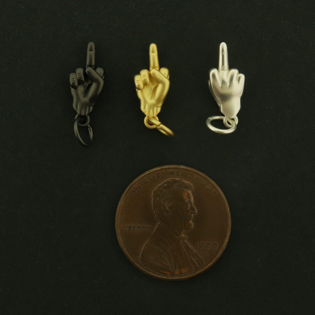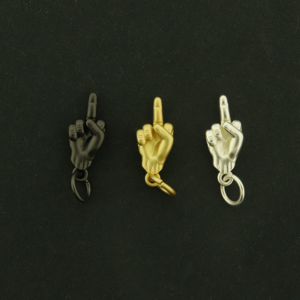 Check out these super realistic middle finger hand sign language charms... with an attached jump ring. They are made of brass, with enamel, rhodium, or 18k gold plating available.