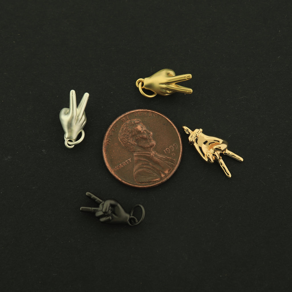 Check out these super realistic peace sign hand symbol sign language charms... with an attached jump ring! They are made of 18k gold plated brass. Available in matte silver, matte gold, shiny gold or black tones!