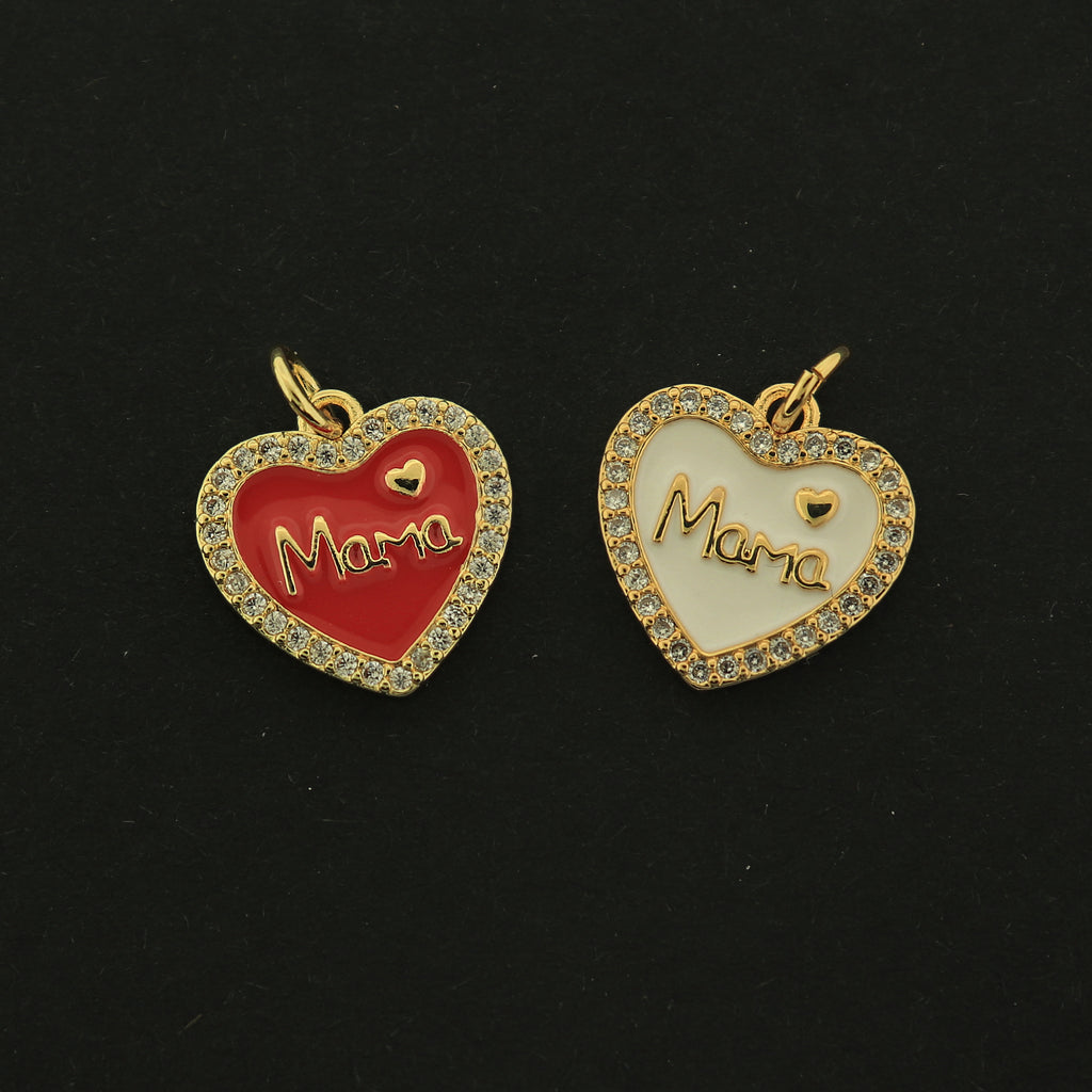 Check out these super cute heart shaped charms with "Mama" and a heart design.. made with inset CZ and enamel with an attached jump ring. They are made of 18k gold plated brass with red or white enamel.