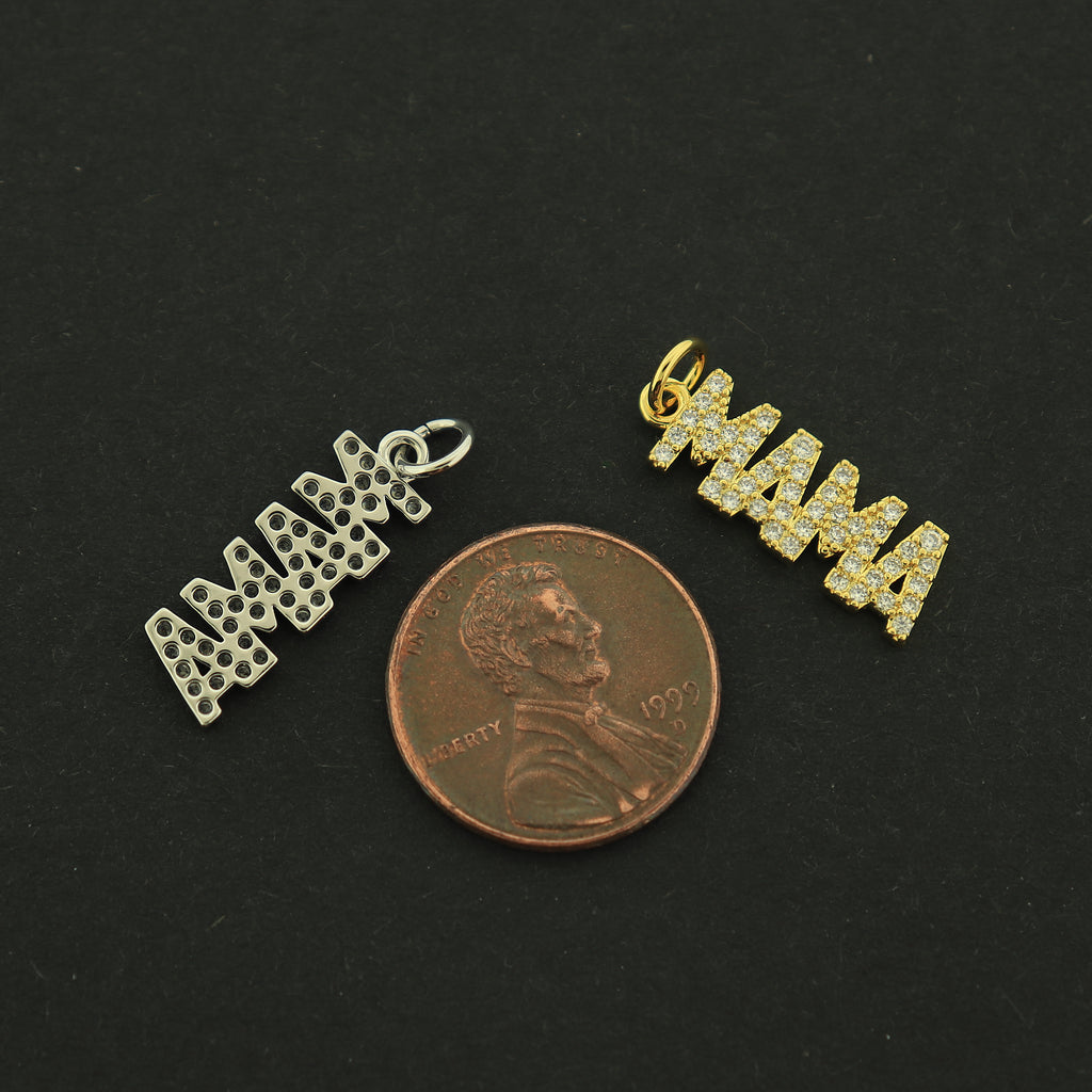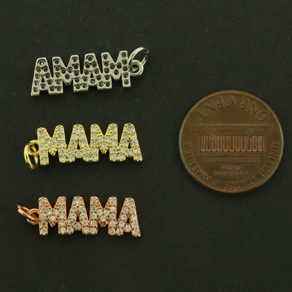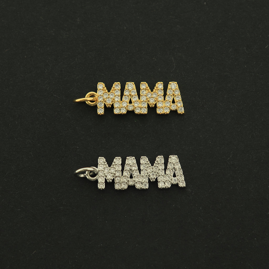 Check out these super cute "MAMA" charms... made of 18k gold and white gold plated brass, they are finished with inset rhinestone details!