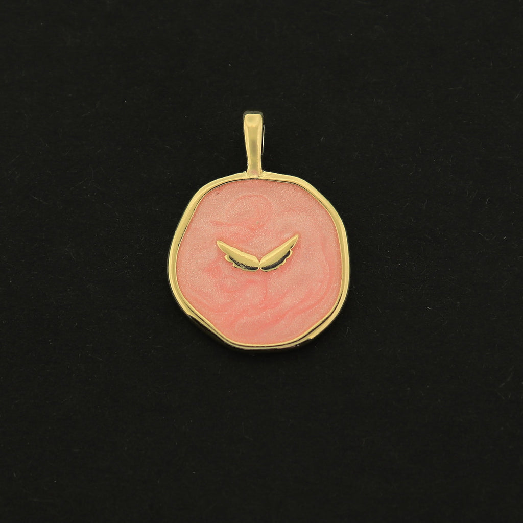 Check out these super cute angel wing disc charms... made of 18k gold plated brass, they are finished with pink mother of pearl shell inlay.