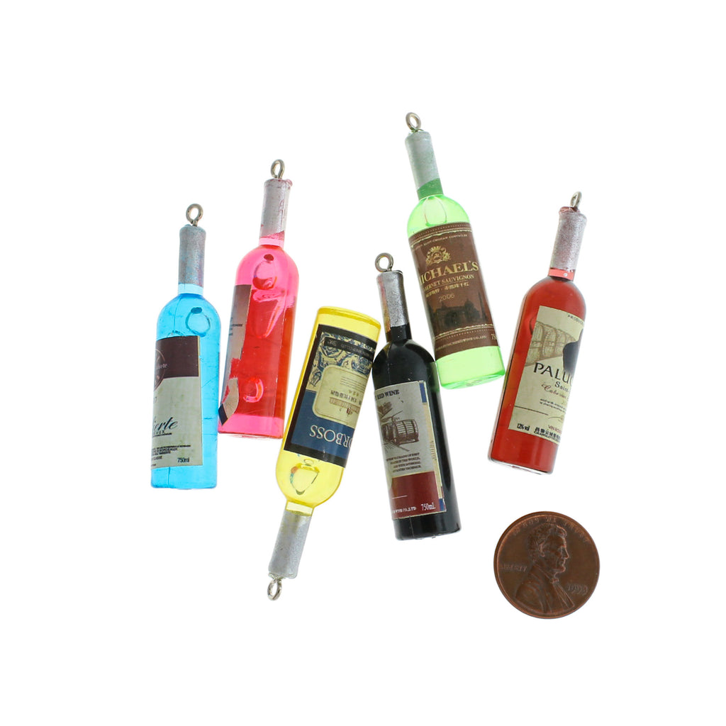 Assorted wine bottle charms with a silver tone loop, in acrylic