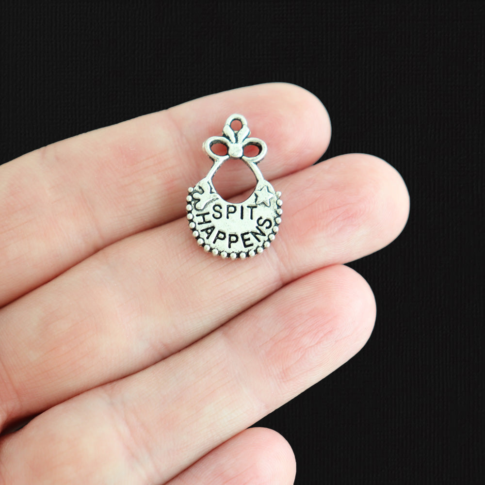 "Spit happens" baby bib antique silver tone charms, in a zinc alloy metal.