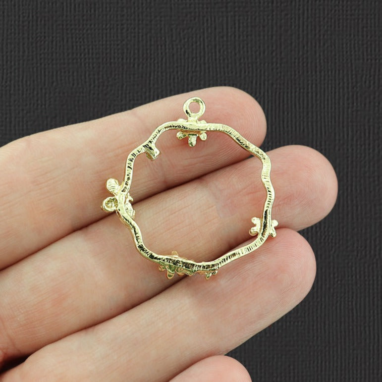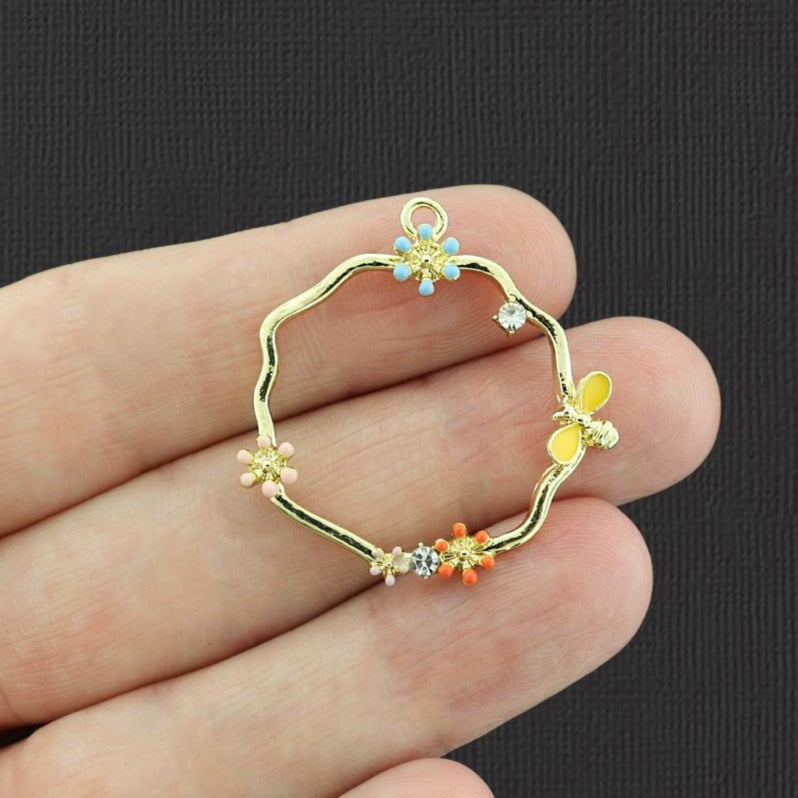 Honeybee and flower circle gold tone charms, in a zinc alloy metal and enamel.