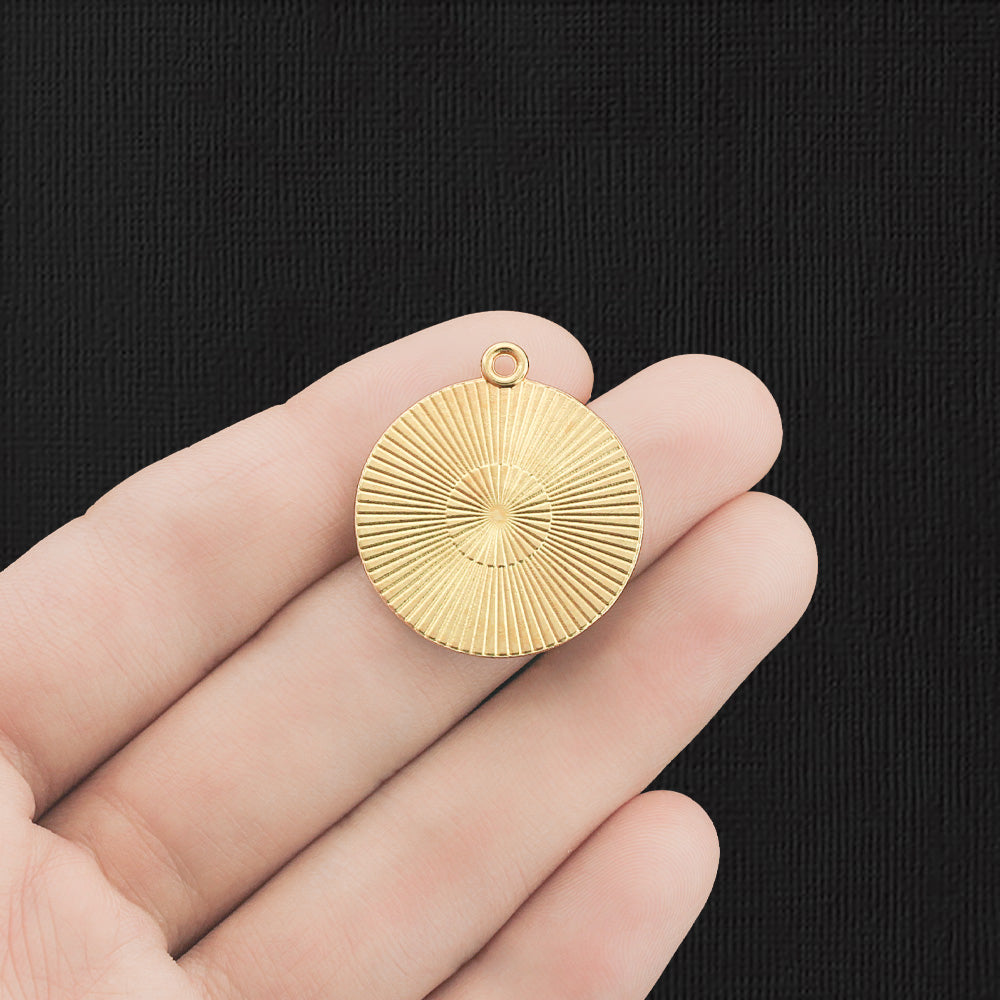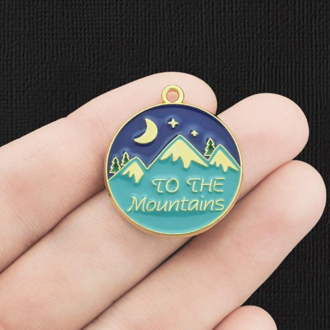 "To The Mountains" blue mountain and crescent moon scene gold tone charms, in enamel and zinc alloy metal.