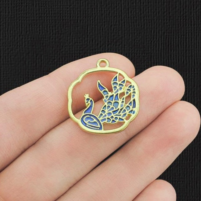 Blue peacock gold tone charms, in a zinc alloy metal and enamel.