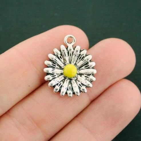 Daisy antique silver tone charms, in a zinc alloy metal with yellow enamel center.