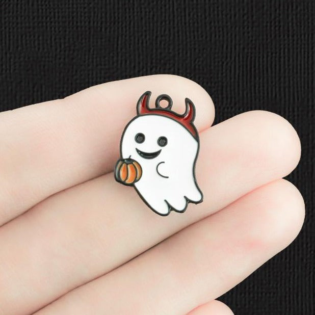 Ghost with devil horns and a pumpkin charms, in a zinc alloy metal and enamel.