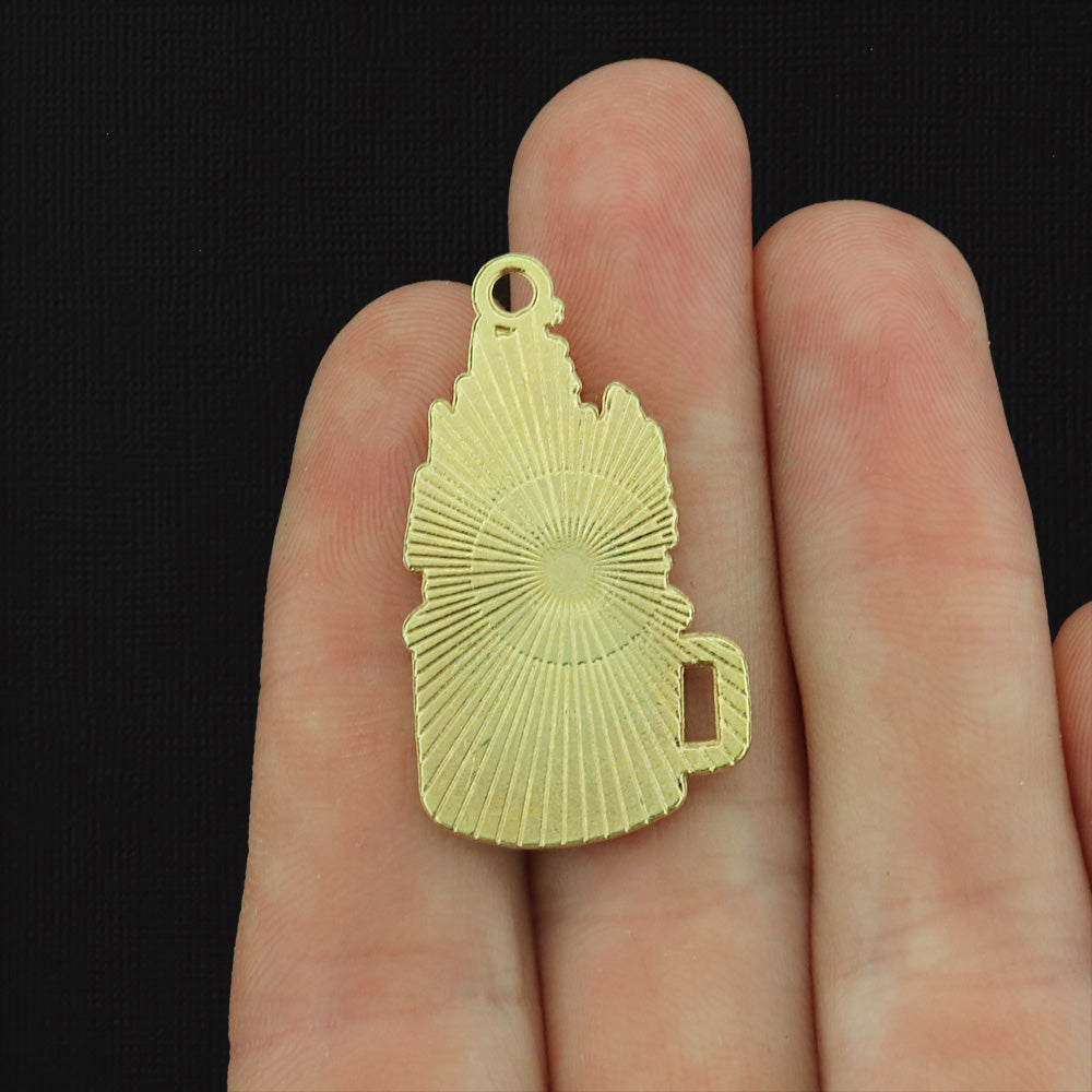 Explore coffee cup with forest, tent and campfire design gold tone charms, in a zinc alloy metal and enamel.