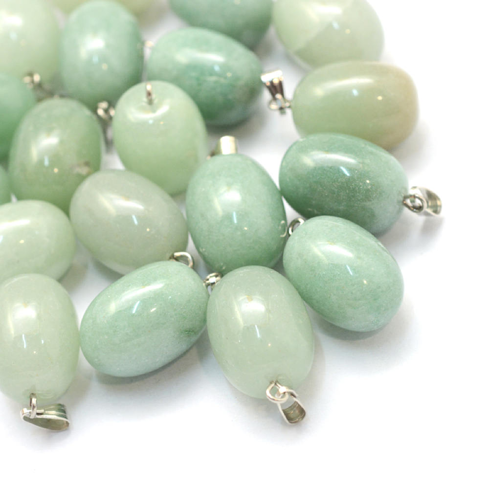 Oval pendants with an attached silver tone bail, in a brass metal and natural aventurine gemstone.