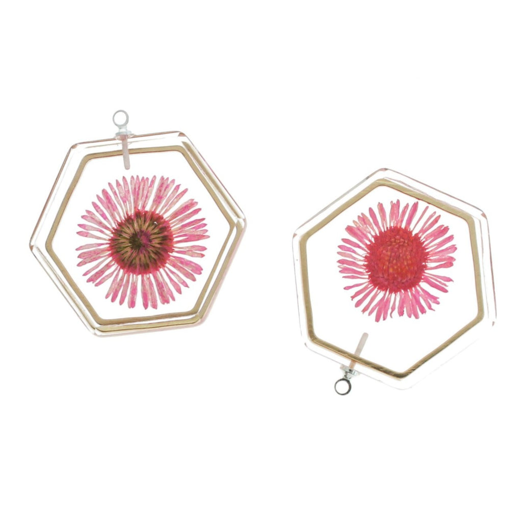 Dried flower set in clear resin, with brass metal frame and silver tone brass loop. Available in purple, pink, or green!