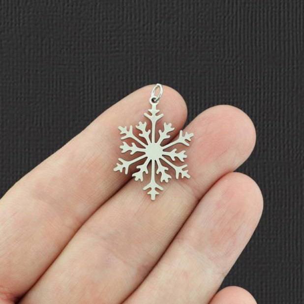 Snowflake silver tone stainless steel charms, with attached jump ring.