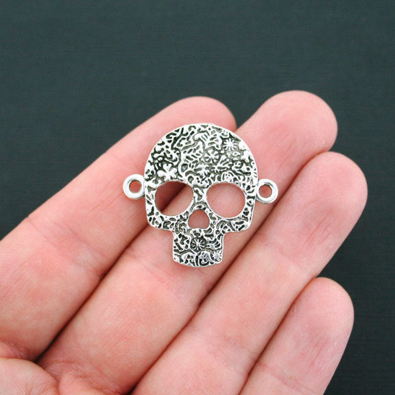 Skull with design antique silver tone connector charms, in a zinc alloy metal.