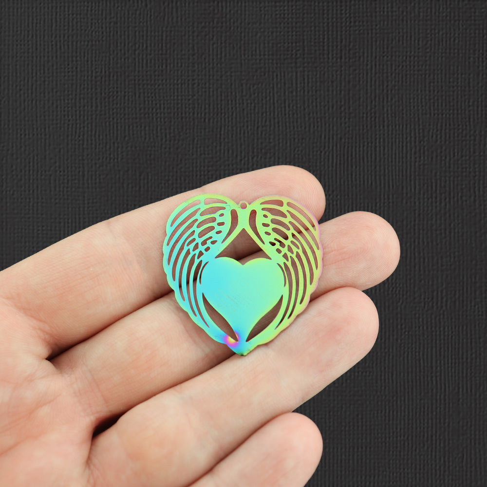 Heart angel wings electroplated rainbow stainless steel charms.