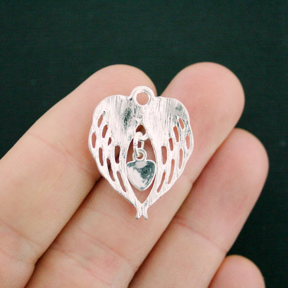 Heart shaped angel wings silver tone charms with dangle heart, in a zinc alloy metal.