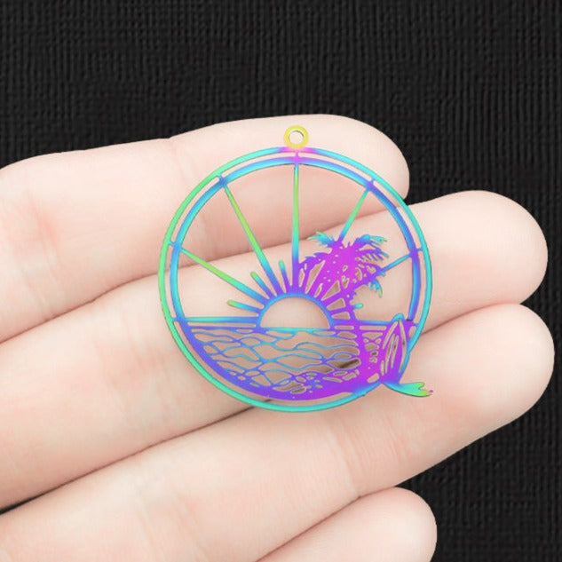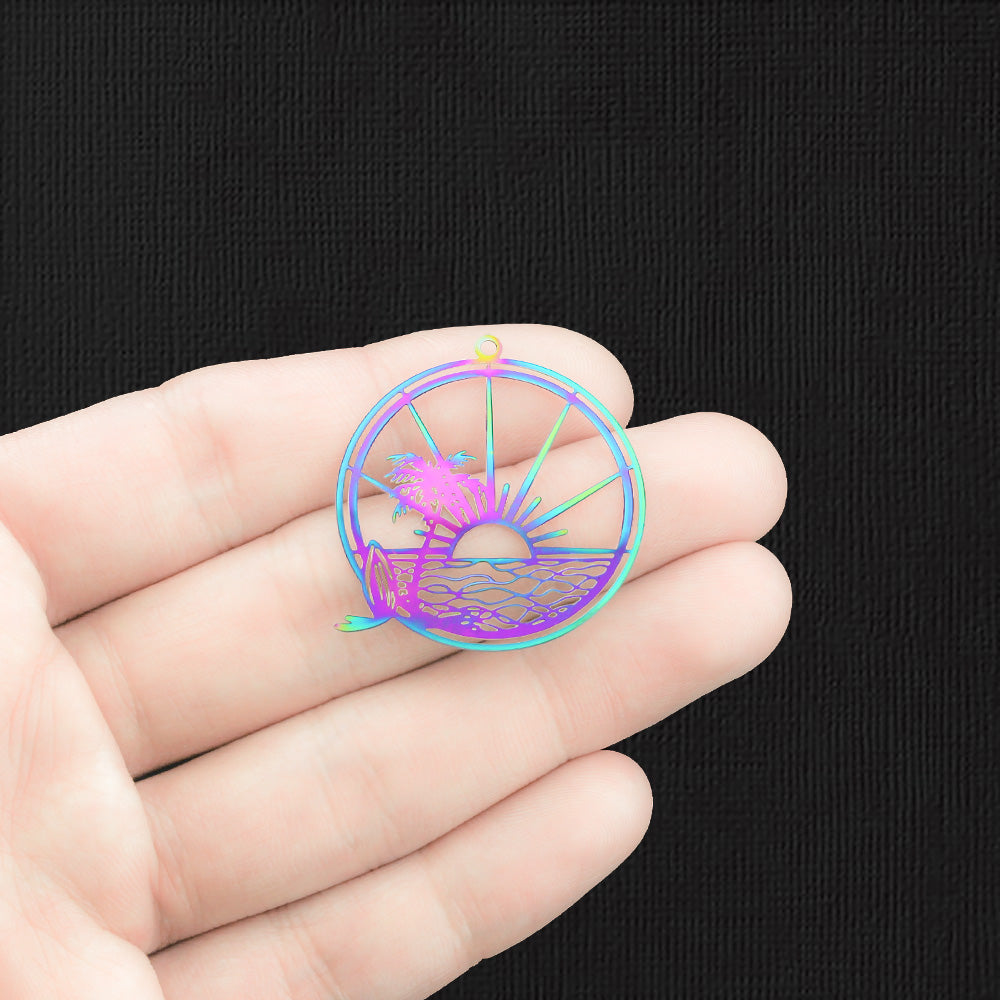 Sun, ocean, and palm tree scene rainbow electroplated charms, in 201 stainless steel.