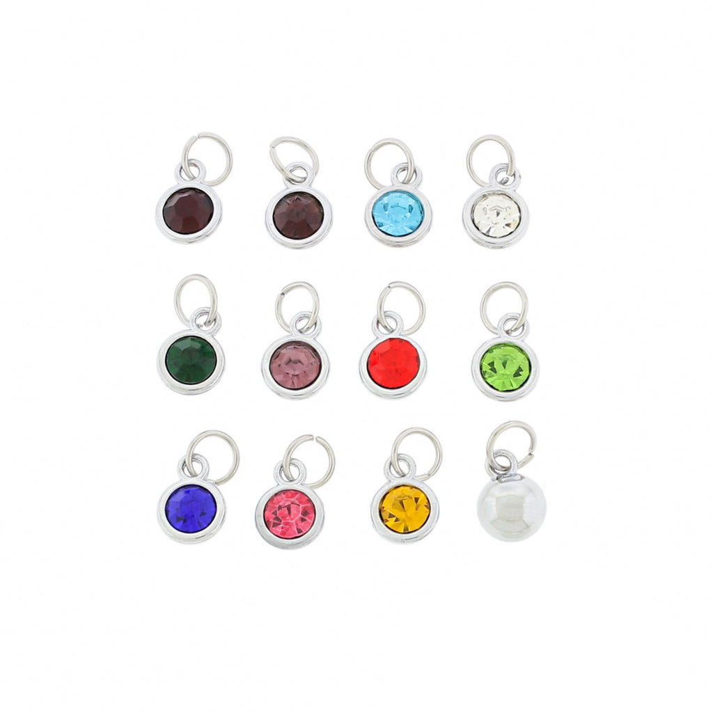Glass birth stonesilver tone charms with attached jump ring, in zinc alloy metal.