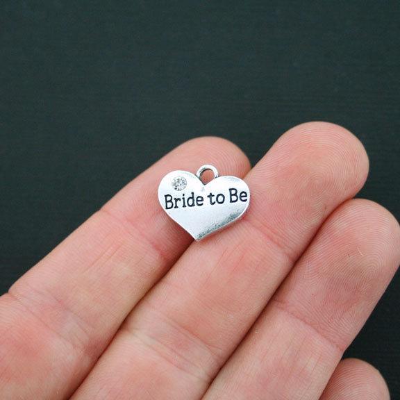Bride to be heart antique silver tone charms with inset clear rhinestones, in a zinc alloy metal.