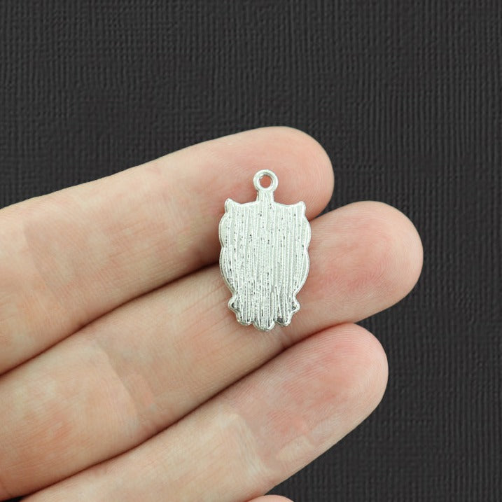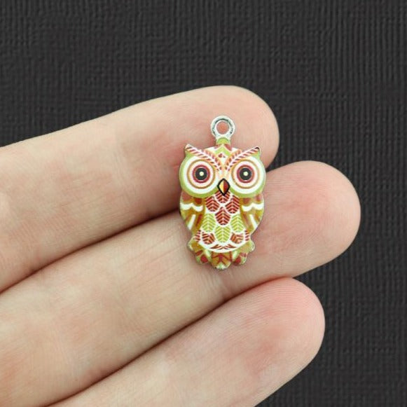 Owl silver tone charms, in a zinc alloy metal and enamel.
