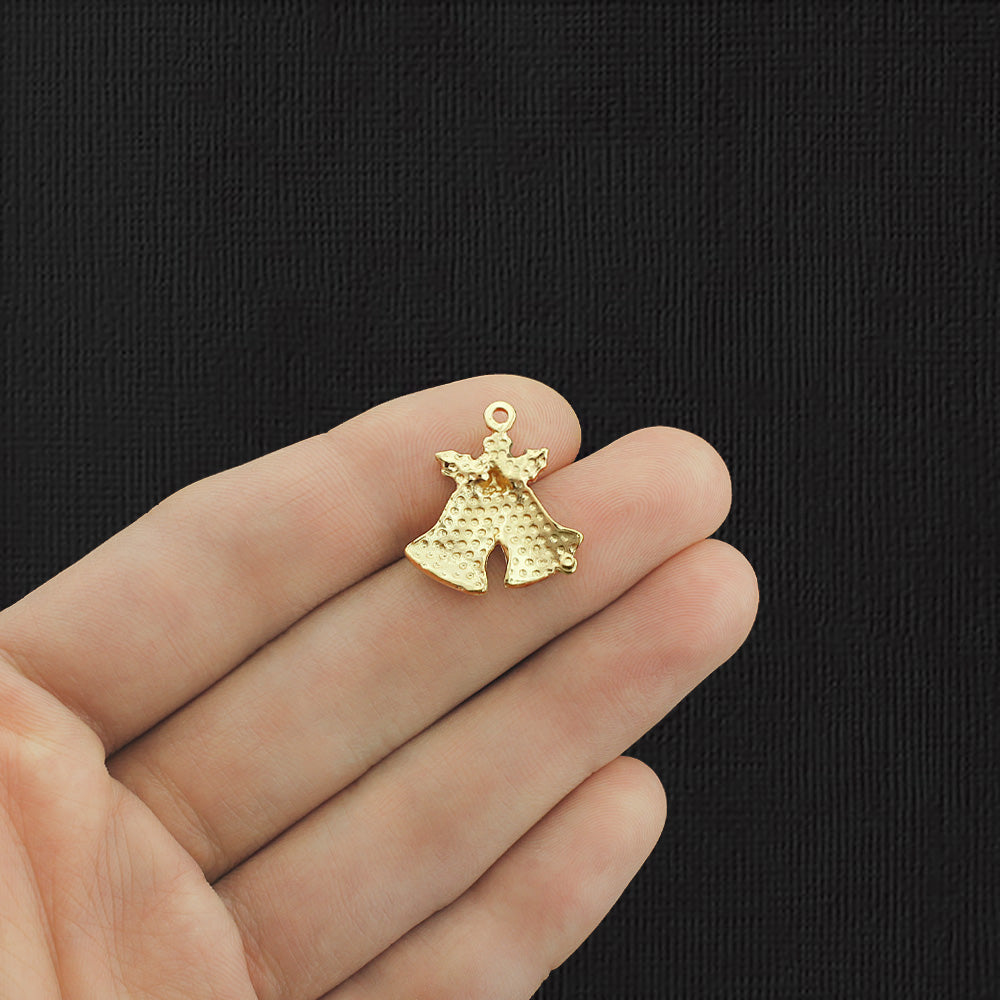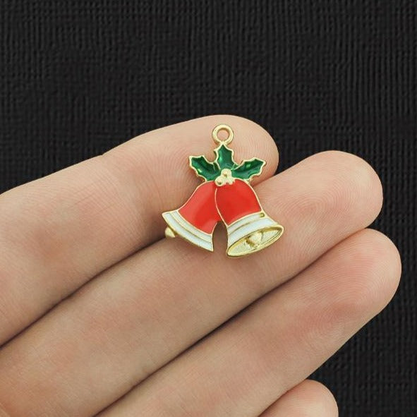 Christmas bells gold tone charms, in a zinc alloy metal and enamel.