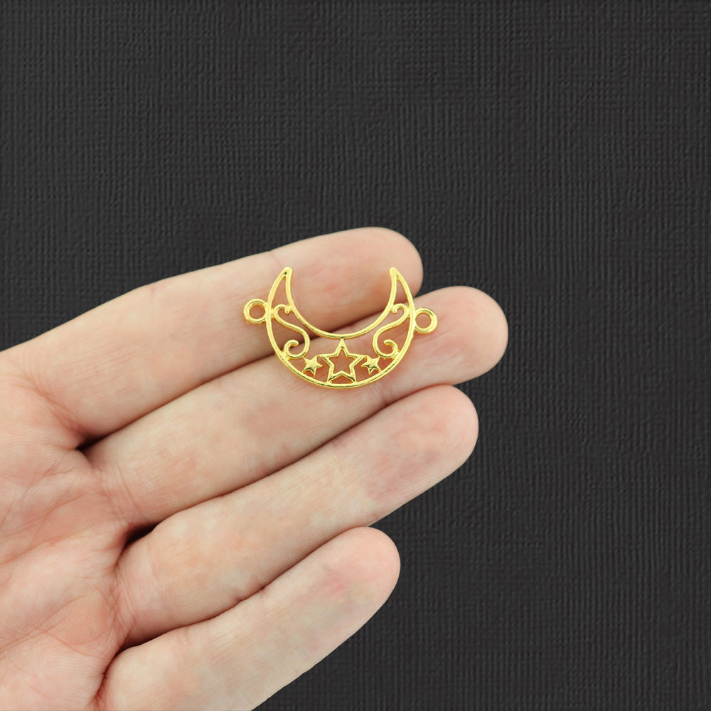 Open crescent moon swirled with star gold tone charms, in a zinc alloy metal.