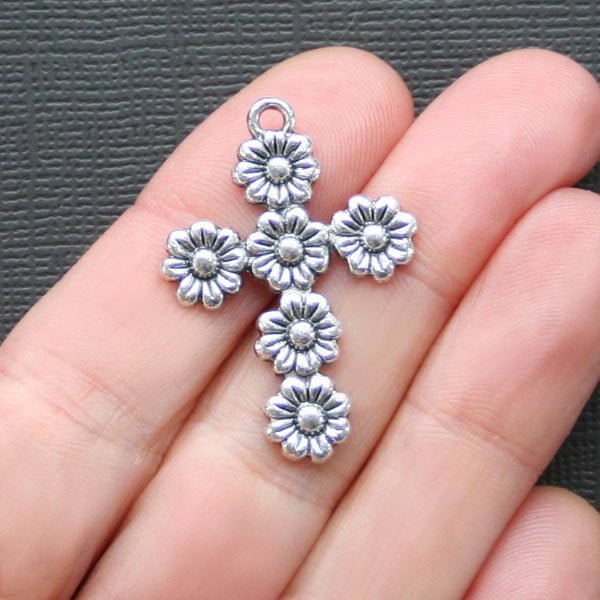Floral cross antique silver tone charms with floral design, in a zinc alloy metal.