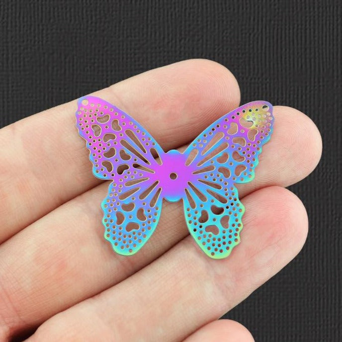 Filigree butterfly connector electroplated rainbow stainless steel charms.