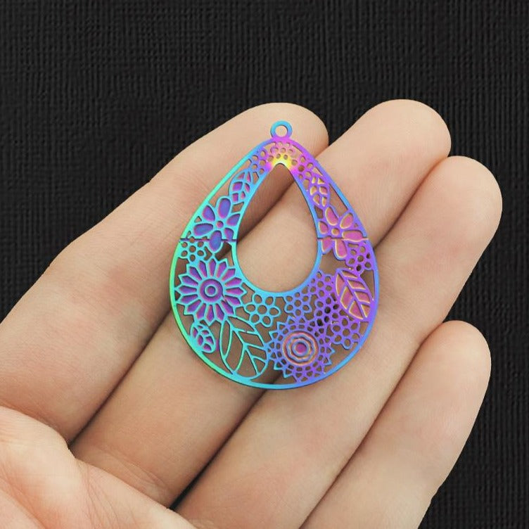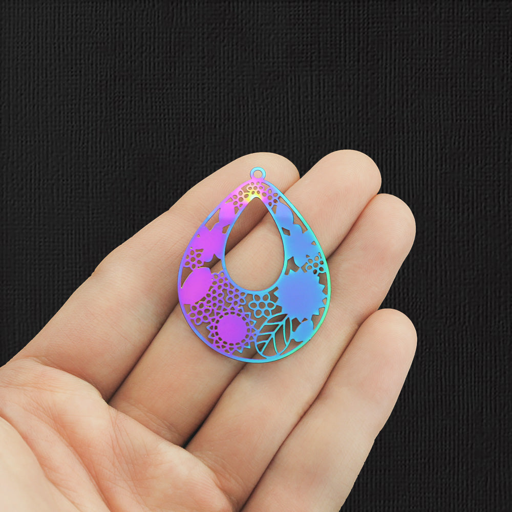 Filigree floral drop electroplated rainbow stainless steel charms.