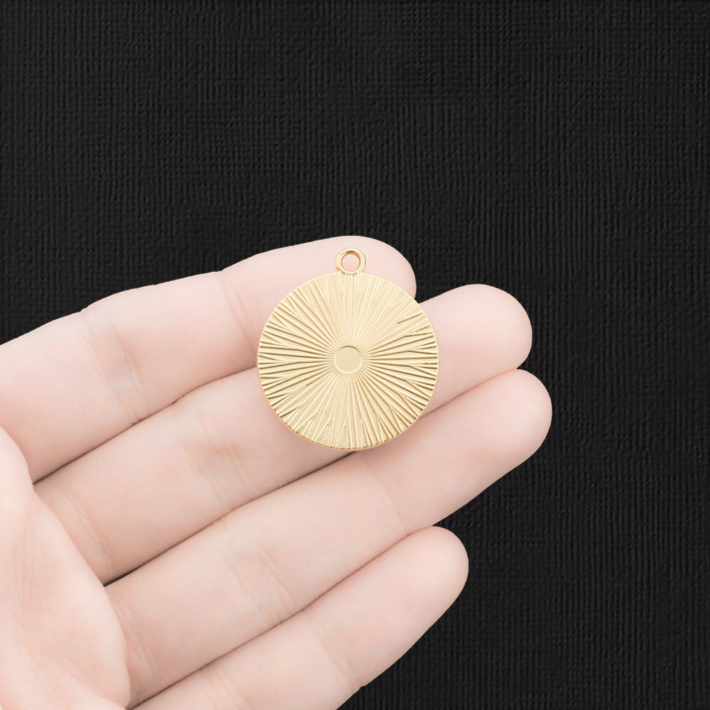Flat round with french bull dog gold tone charms, in a zinc alloy metal and enamel.