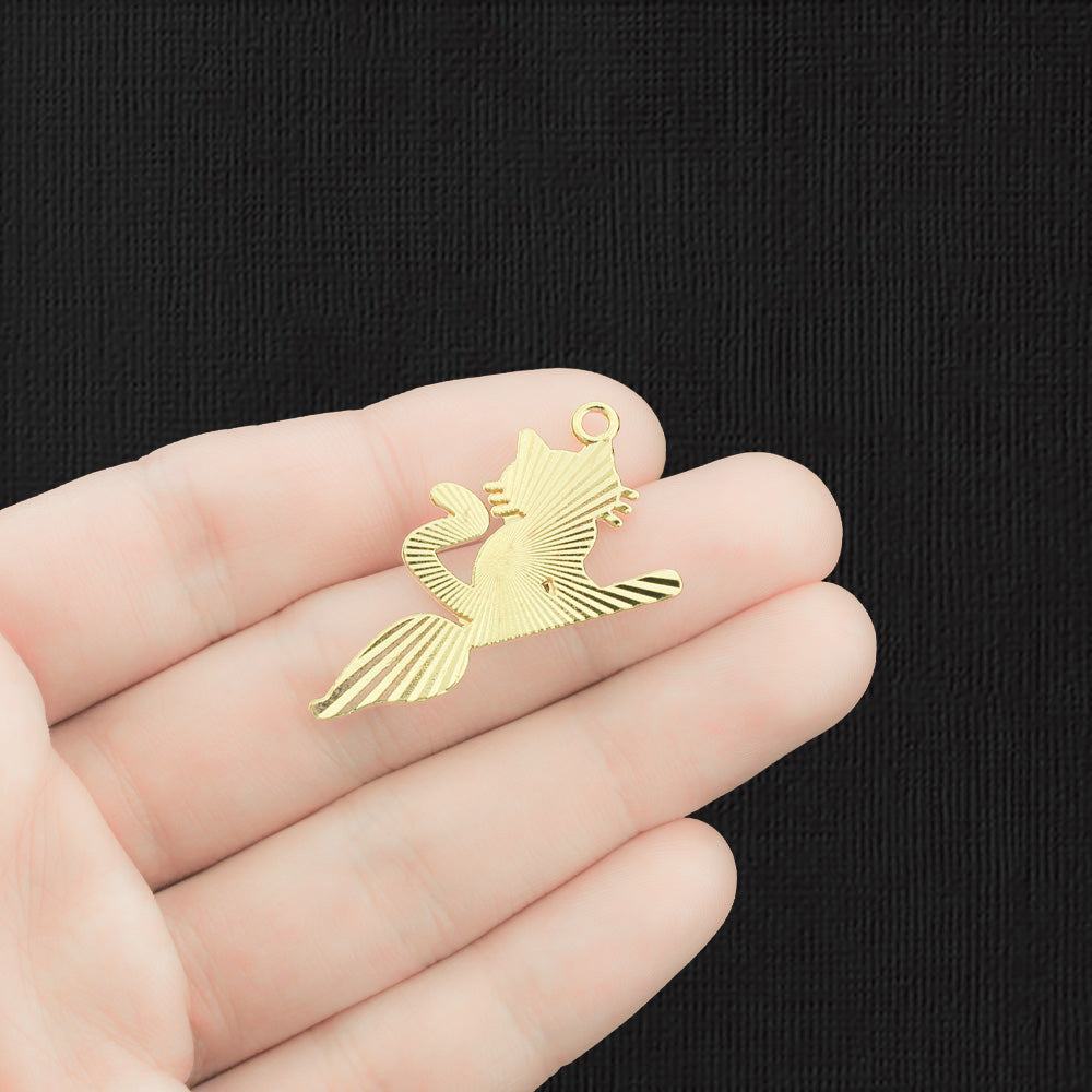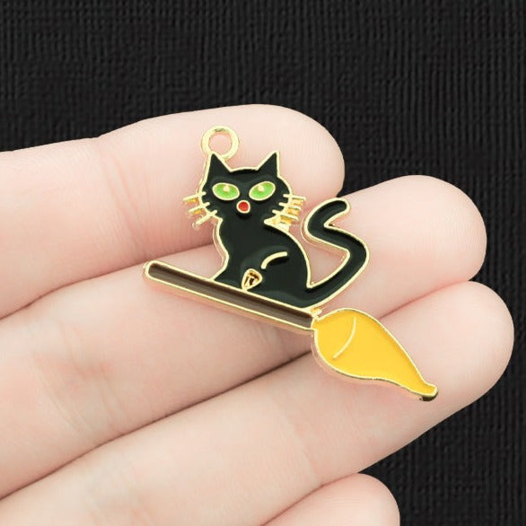 Black cat on a broom stick gold tone charms, in a zinc alloy metal and enamel.