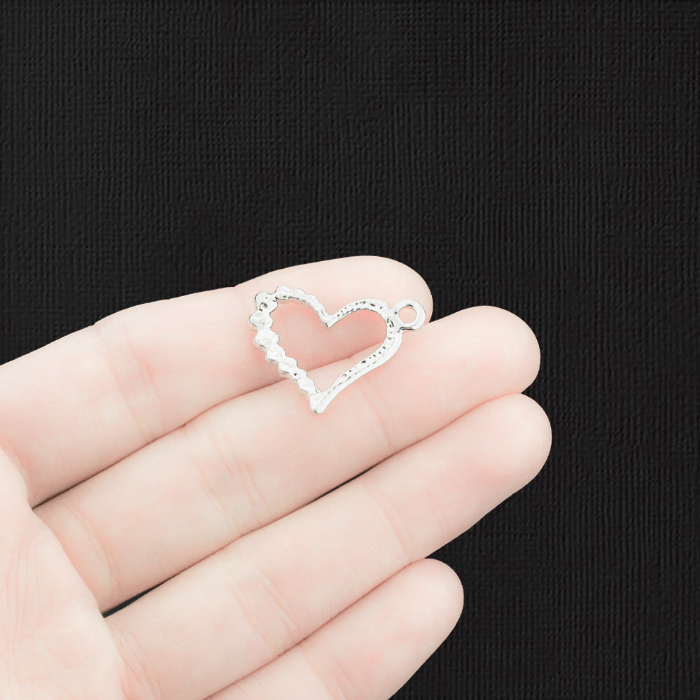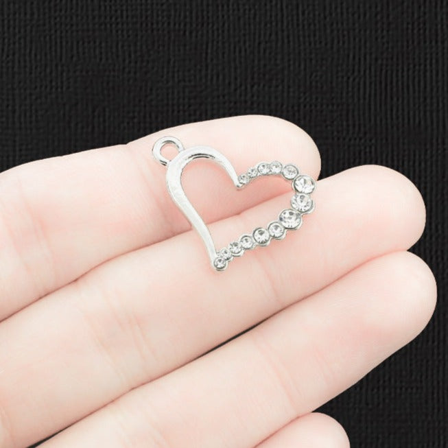Heart silver tone charms with inset clear rhinestones, in a zinc alloy metal.