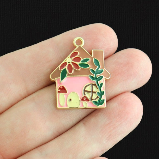 Pink house with mushroom and flowers gold tone charms, in a zinc alloy metal and enamel.