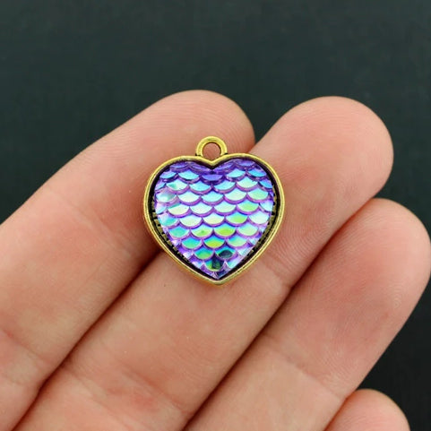 Mystic purple heart mermaid scale antique gold tone zinc alloy and resin charms.