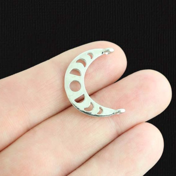 Crescent moon silver tone connector charms with moon phases cutouts, in a zinc alloy metal.